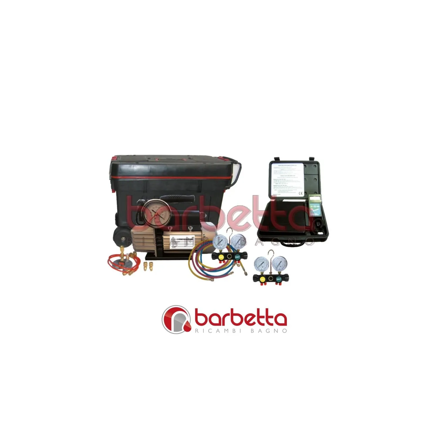 Sistema di vuoto ricarica multigas che comprende: -Pompa di Vuoto doppio stadio con elettrovalvola dotata di 2 manometri con scale R410/ R22-R407 e due serie di tubi flessibili. Bilancia da 55 kg e raccorderia varia di collegamento. Materiale Cetificabile a Richiesta. Prodotto a marchio HyWerk.