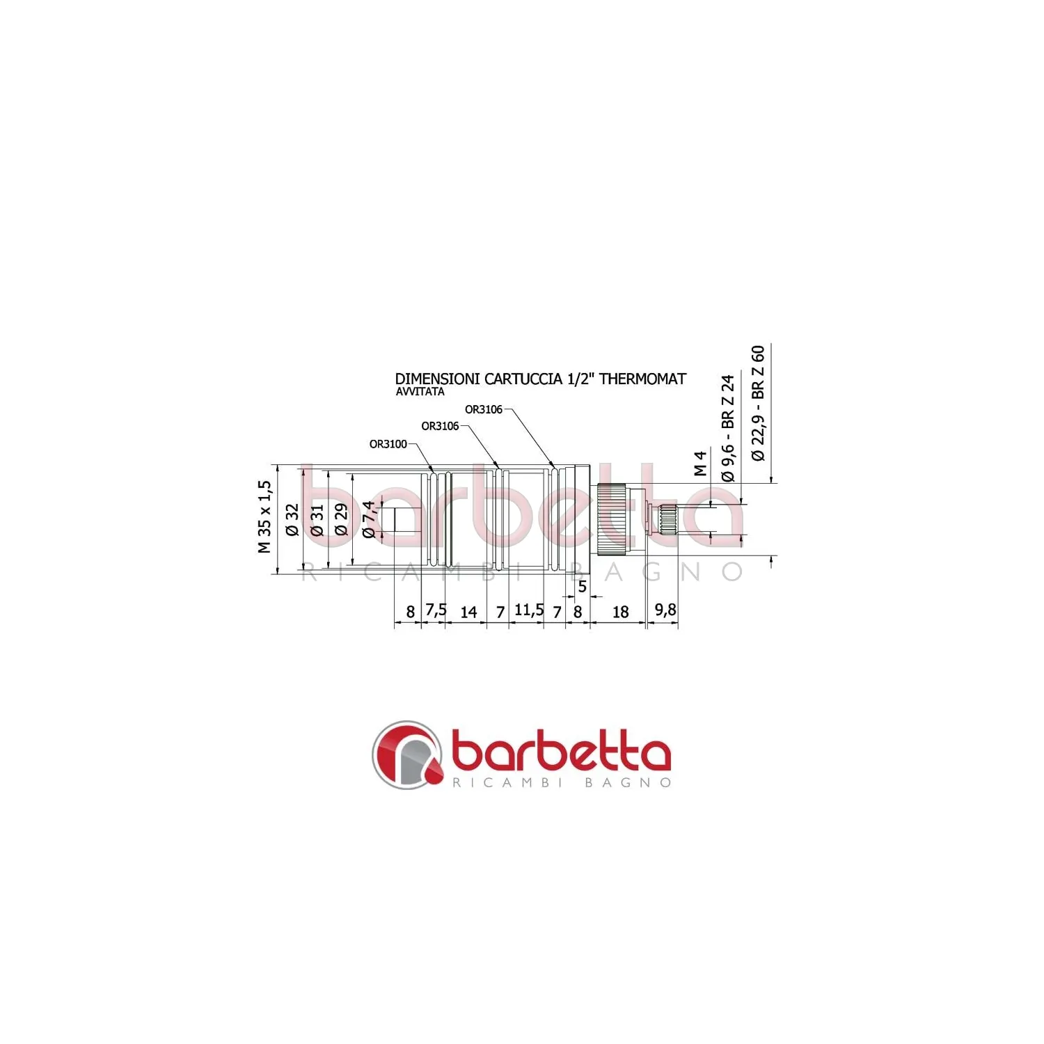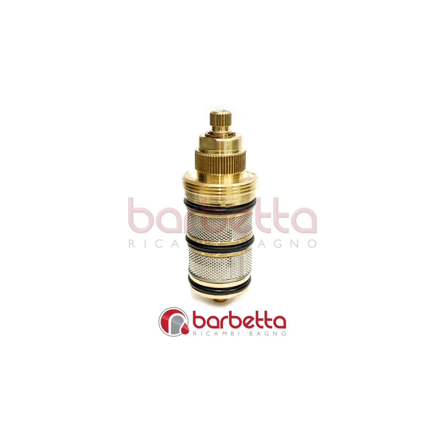 Cartuccia termostatica a fissaggio con grano radiale e testa con corona filettata.