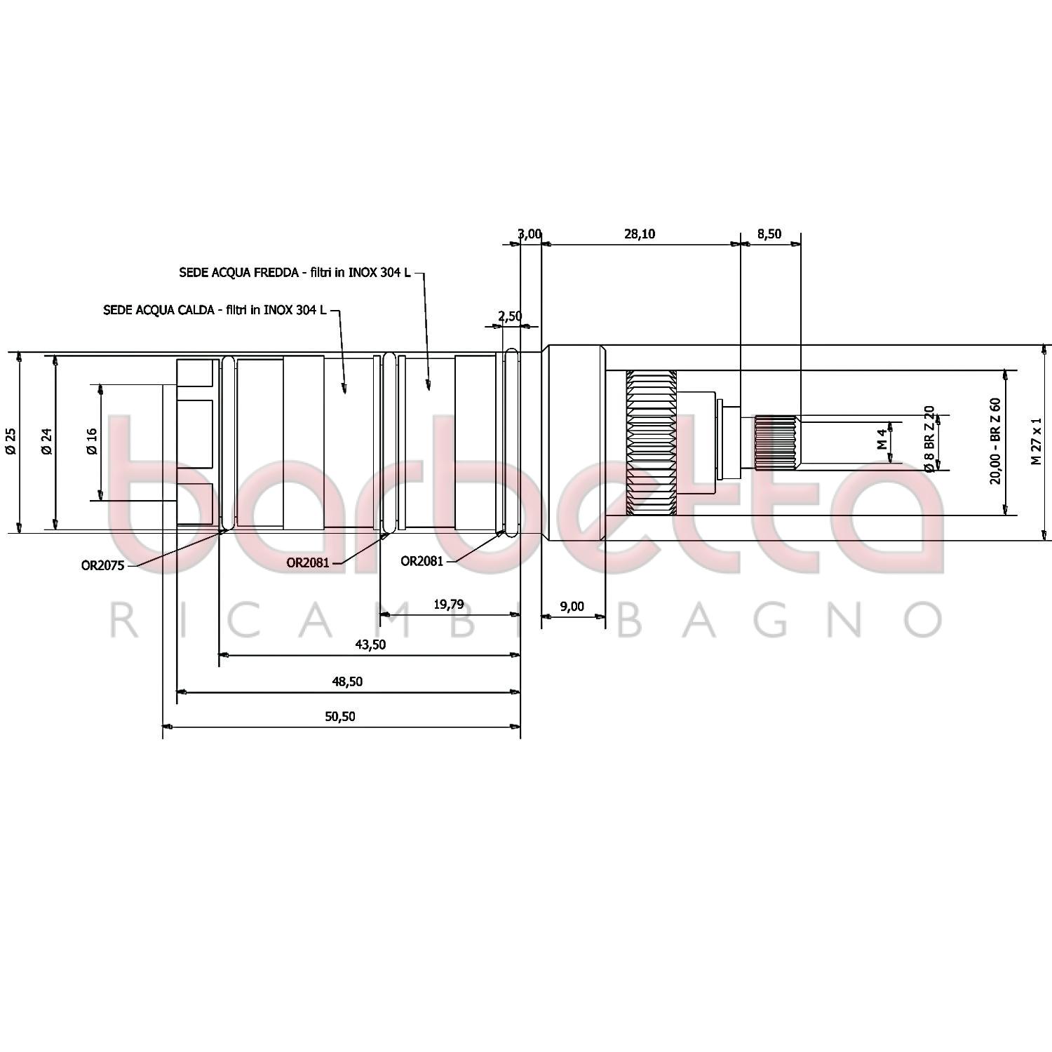 Cartuccia termostatica ½” dimensioni ridotte ø 25 mm: avvitata su corpo con sede M 27 x 1. E’ un dispositivo estraibile che comprende tutta la parte funzionale del miscelatore termostatico. La cartuccia THERMOMAT viene bloccata nel corpo del miscelatore mediante spina di acciaio inox (brev. dep.) oppure grano radiale che ne determina anche la corretta messa in fase. È collaudata e tarata in fabbrica.